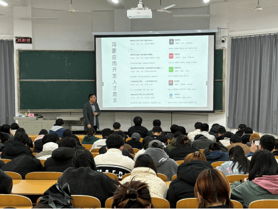 (通讯员:高雅琦)2025年3月13日,方阵集团资深技术专家刑明辉应邀为我院2021级及2022级学生作主题为《鸿蒙开发:国产化替代的黄金赛道》的专题报告。讲座聚焦国产操作系统鸿蒙的技术革新与产业前景,从行业趋势、职业机遇、实践路径三个维度为学子剖析未来技术赛道的发展逻辑,助力学生锚定职业规划方向。